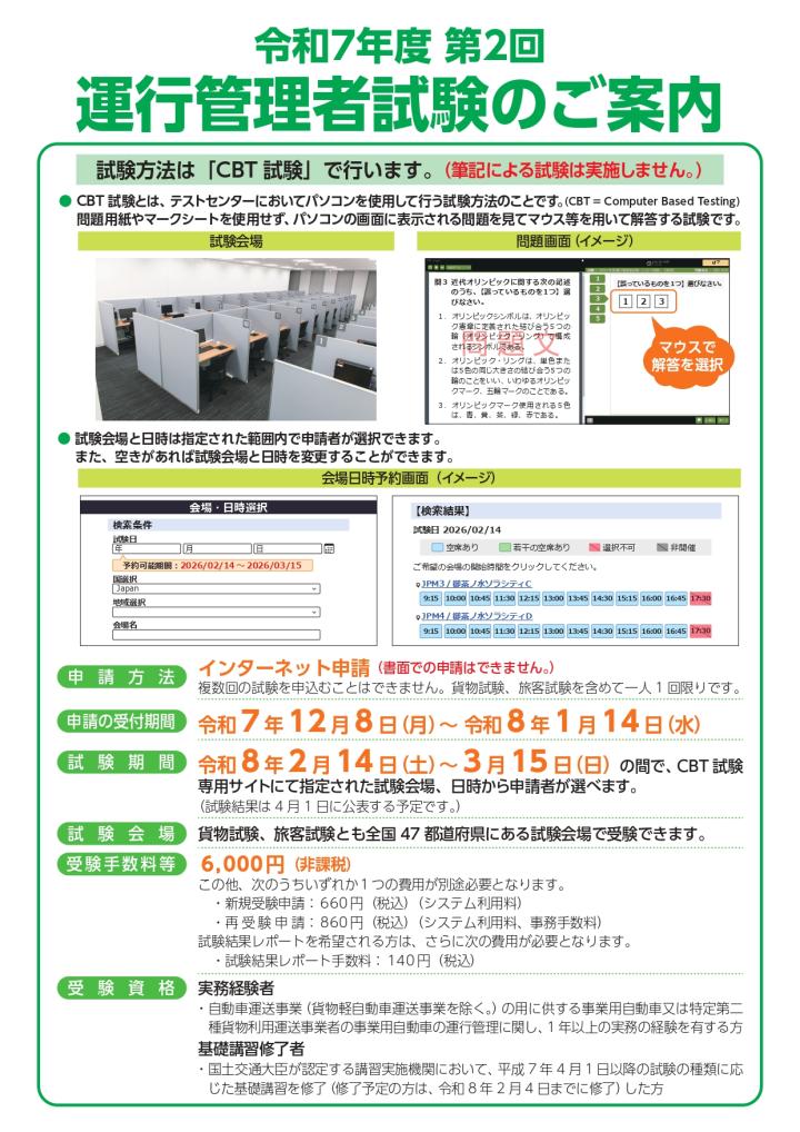 令和7年度第2回運行管理者試験のご案内 2025.11.05 運行管理者・整備管理者 運行管理者試験センター 詳細は運行管理者試験センターホームページをご覧ください。 公益財団法人 運行管理者試験センター (unkan.or.jp) CBT試験 チラシ 2025 2nd.pdf
