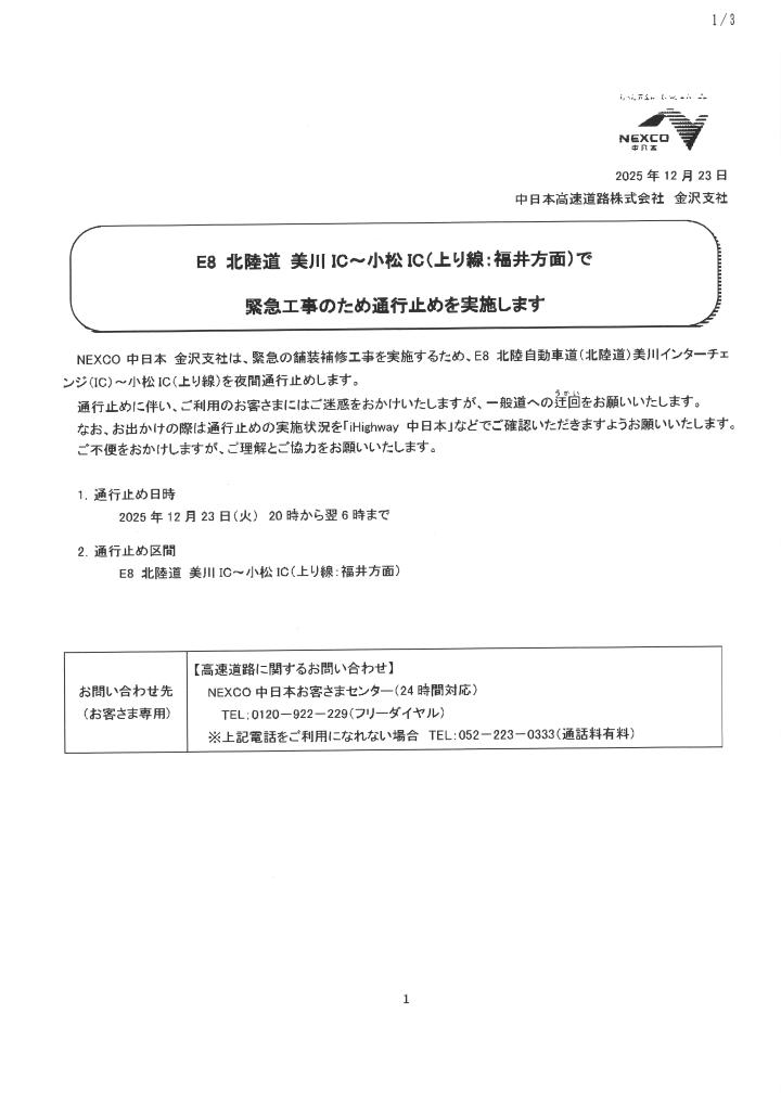 E8北陸道 美川IC~小松IC(上り線:福井方面)緊急工事のため通行止め 2025.12.23 道路交通情報 NEXCO中日本 E8北陸道 美川IC~小松IC(上り線:福井方面)緊急工事のため通行止め.pdf