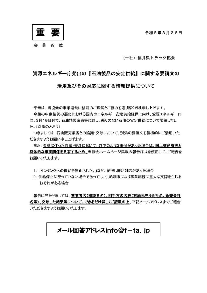 資源エネルギー庁発出の『石油製品の安定供給』に関する要請文の 活用及びその対応に関する情報提供について 2026.03.26 燃料価格高騰対策 福井県トラック協会 260319_石油備蓄法に基づく対応に関する更なる御協力について(要請).pdf 会事業者相談フォーム.xlsx